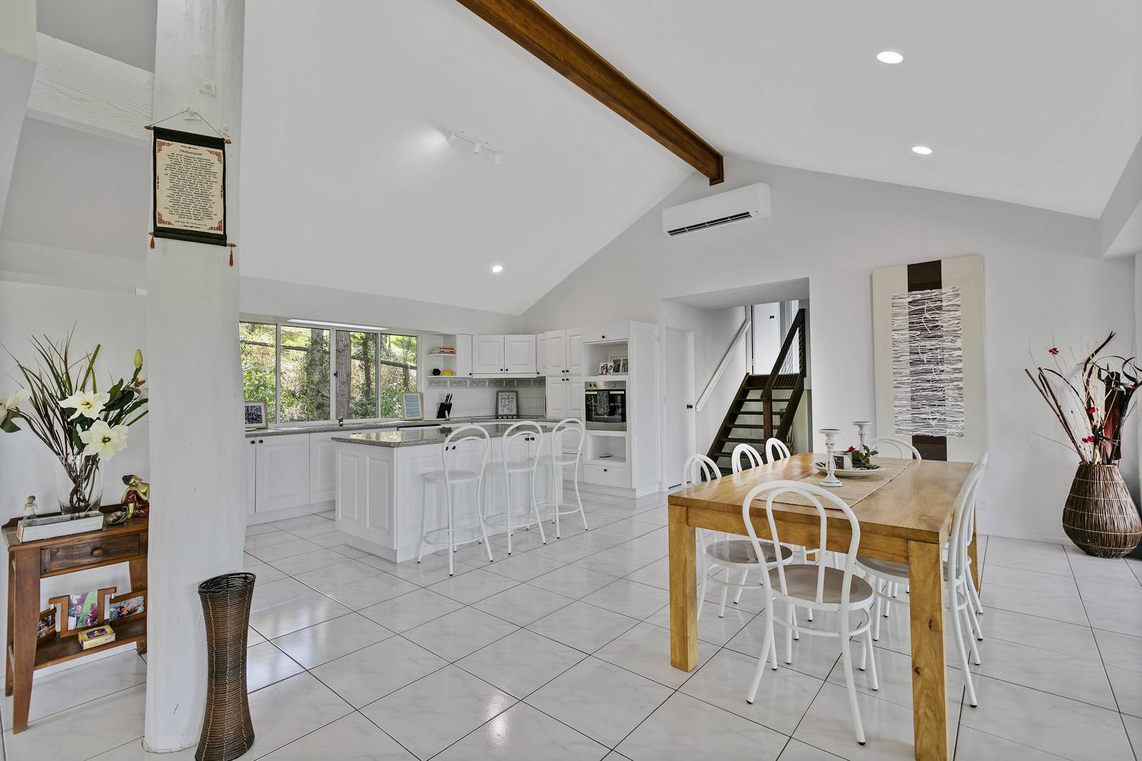 * An open plan kitchen & dining area with beautiful high raked ceilings, opening onto a huge deck with amazing views to Buderim.