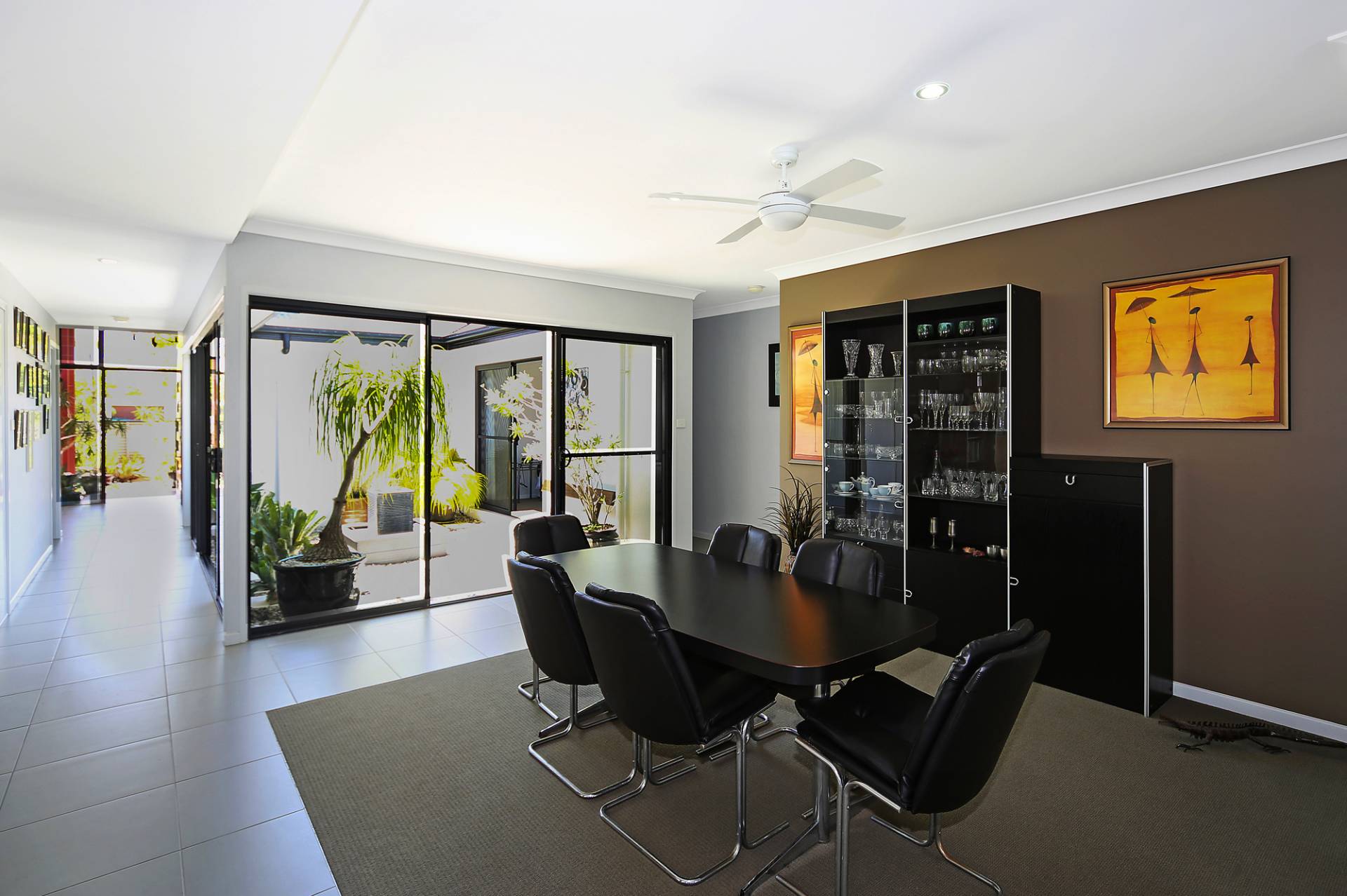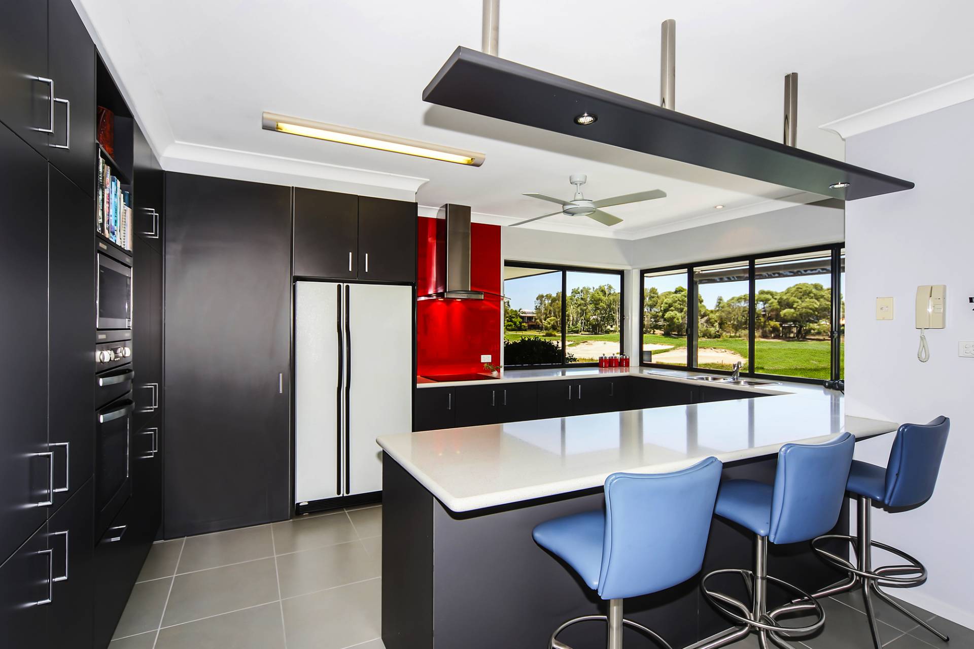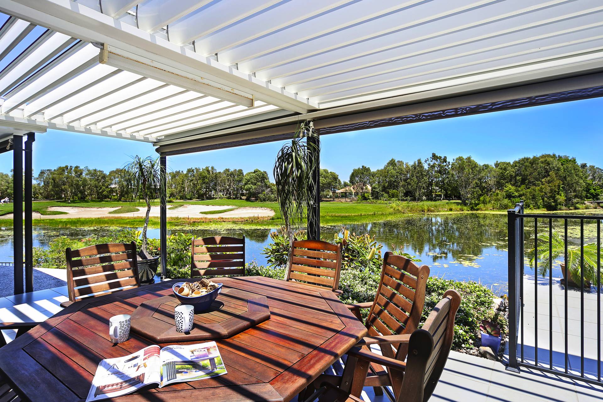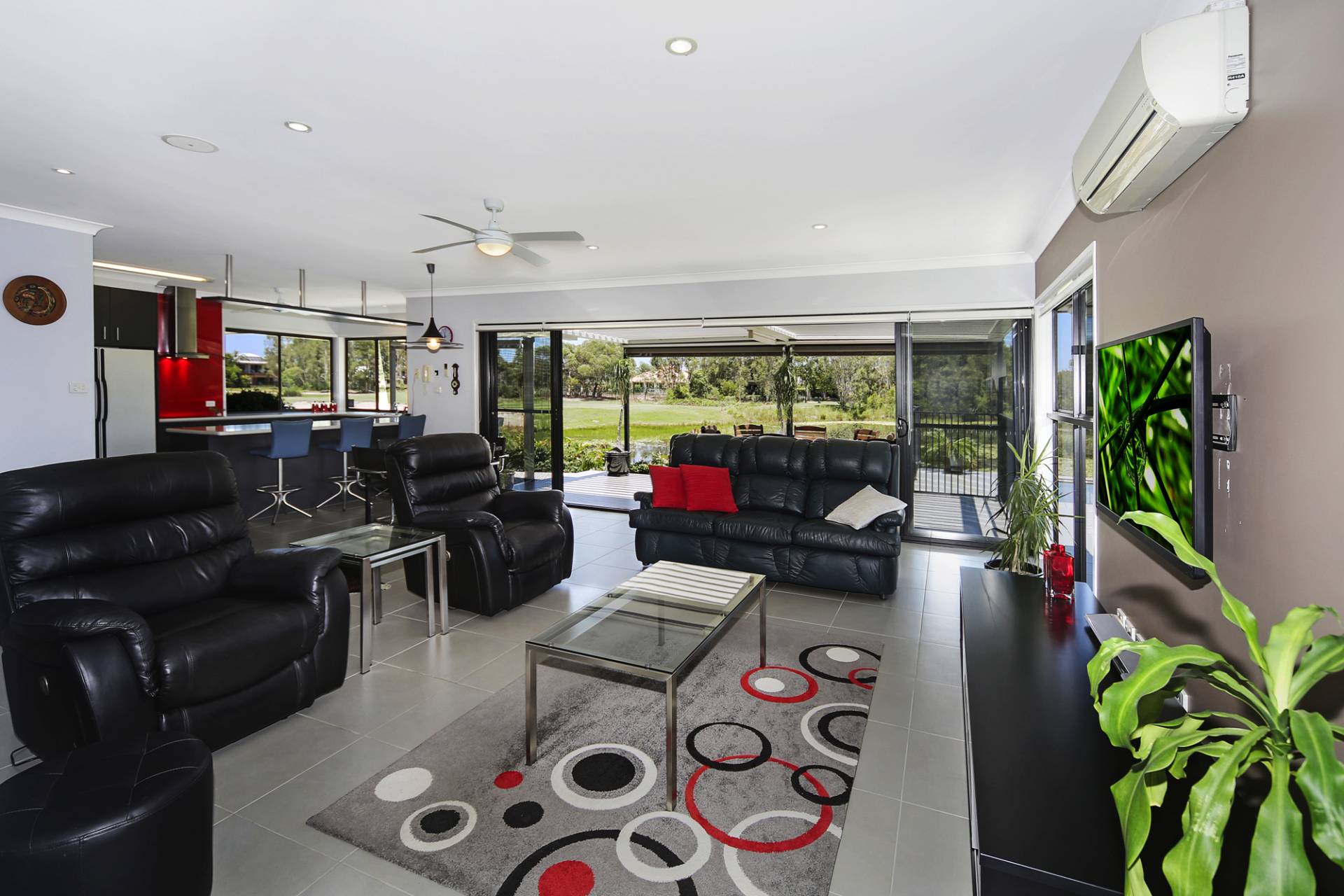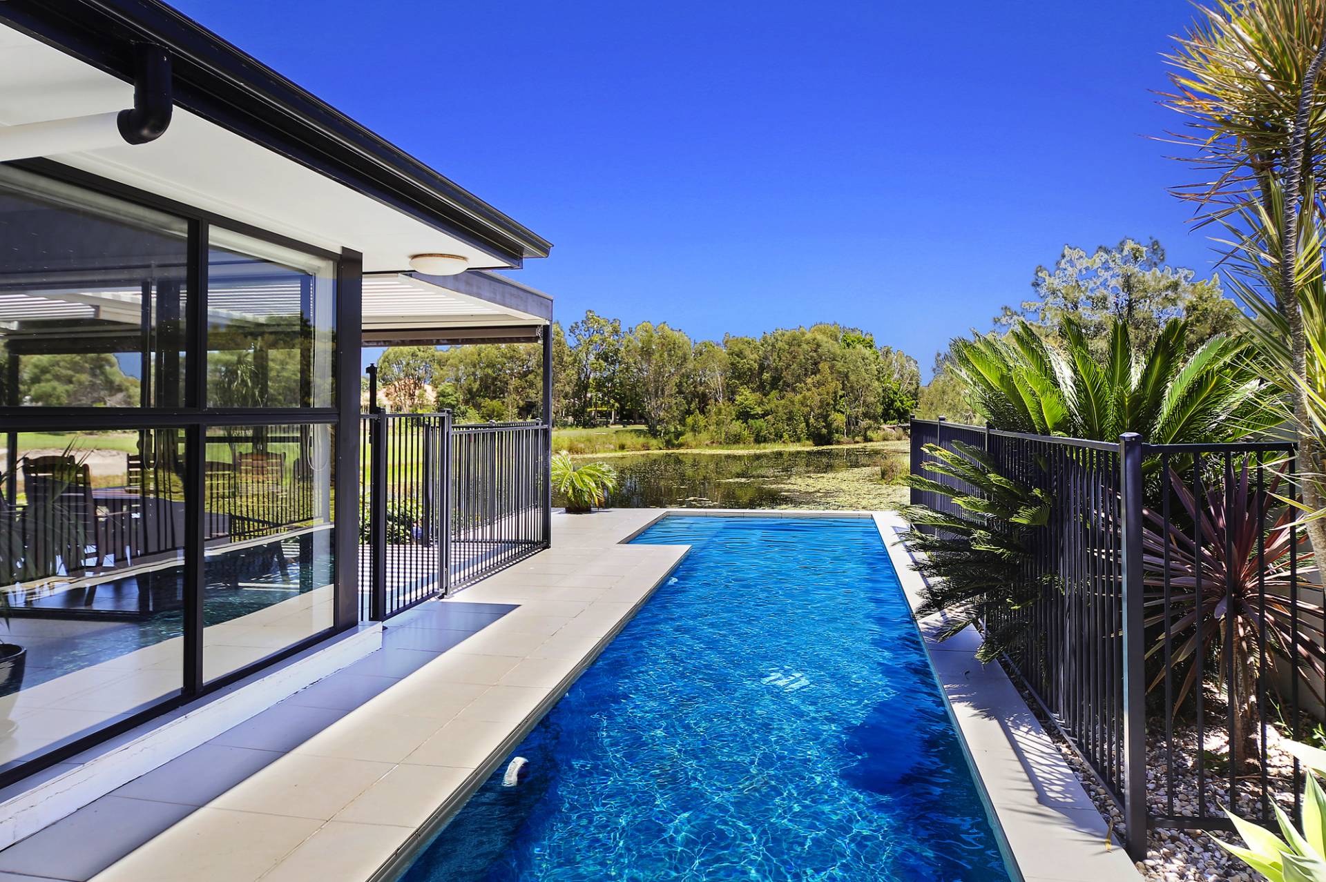 The expansive main open-plan living area is comprised of multiple zones that have the flexibility to be used for both formal and everyday living. Complete with fans and reverse cycle air conditioning, this inviting space flows through a large bank of sliding doors to an alfresco entertaining area that overlooks the lake and the natural ecosystem that it supports. The manicured 14th hole of the golf course and saltwater lap pool complete this stunning outlook.