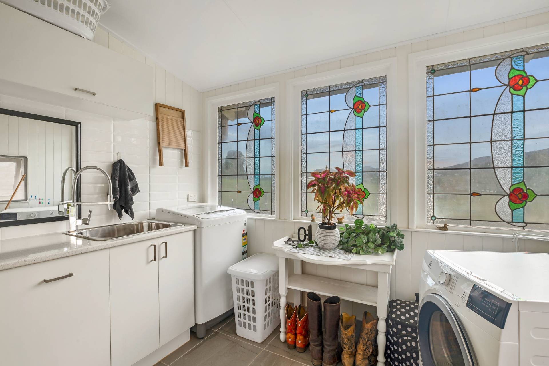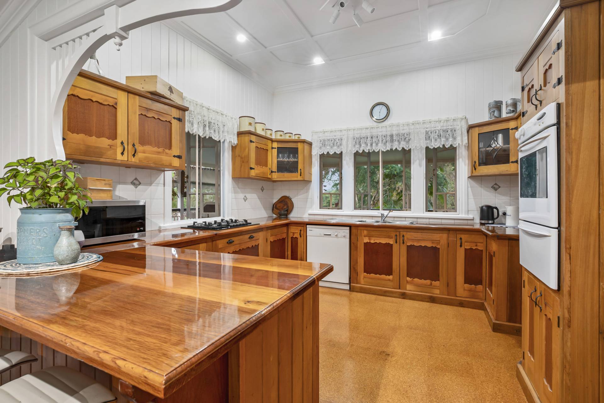 Exit to the rear – the dining room and quaint country kitchen. The kitchen is timeless. Quality cabinetry inlaid with silky oak and leadlight panels, a highly polished and lacquered bench surface, and charming overhead fretwork. Convenient servery windows to the veranda ensure entertaining ease.