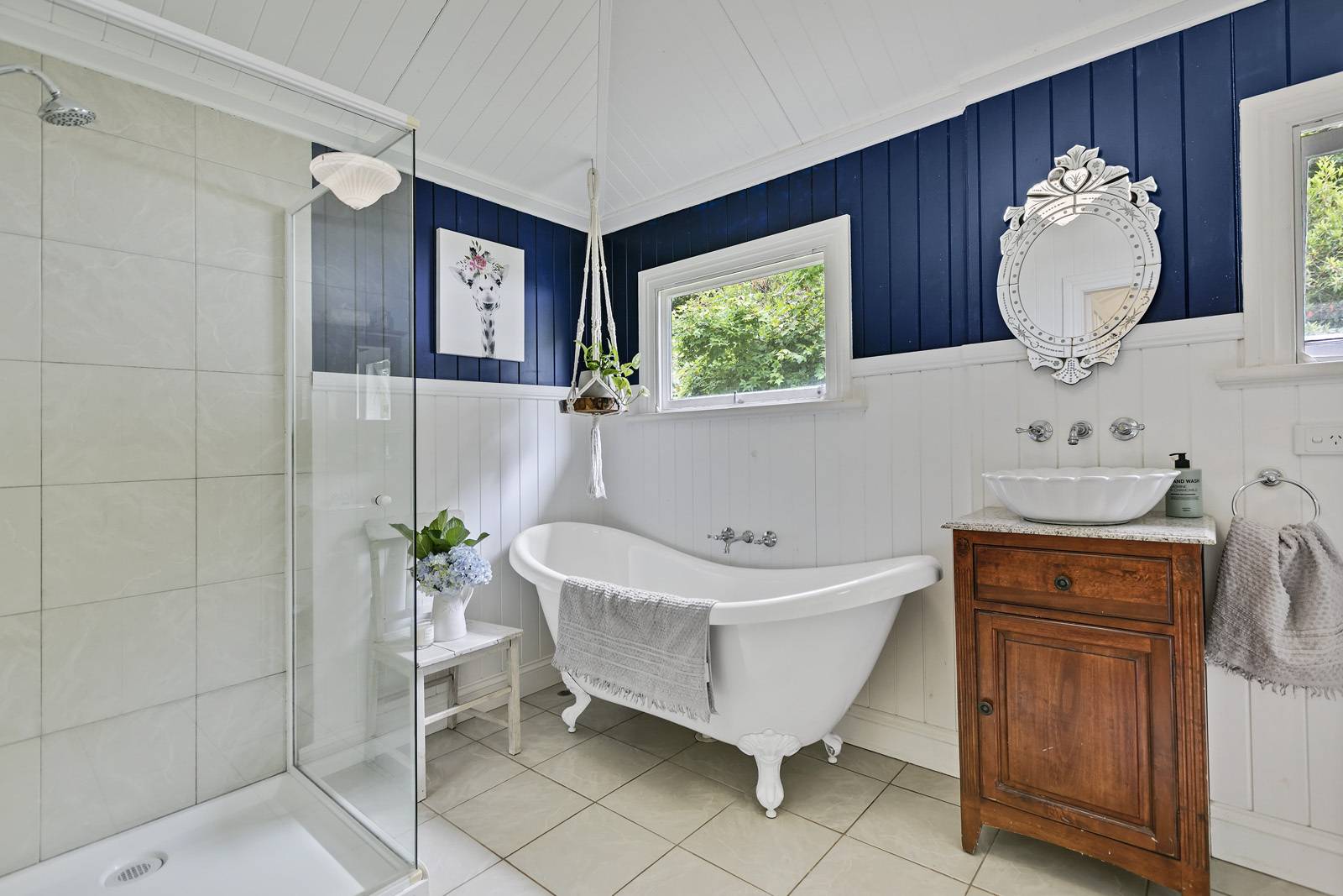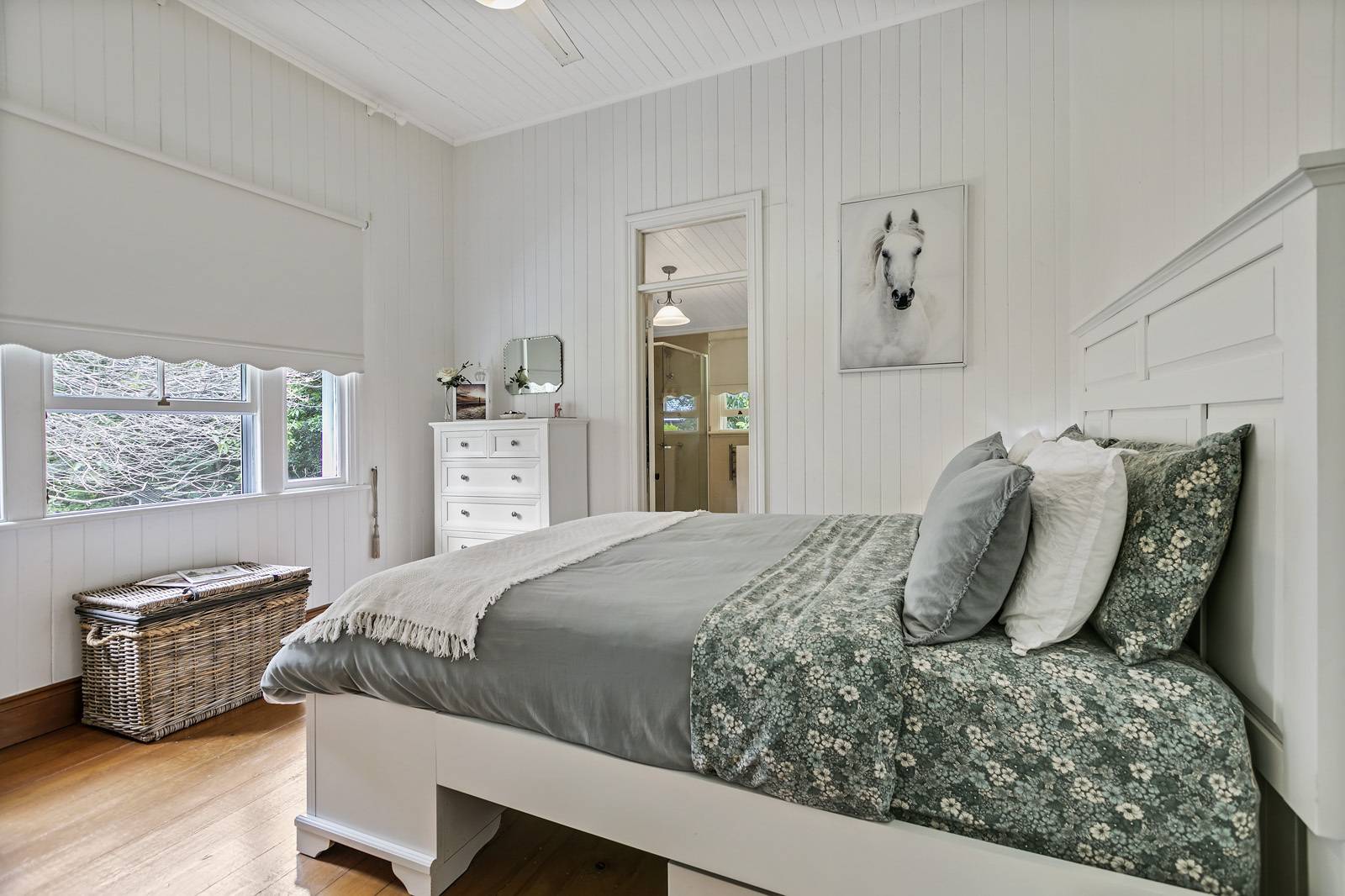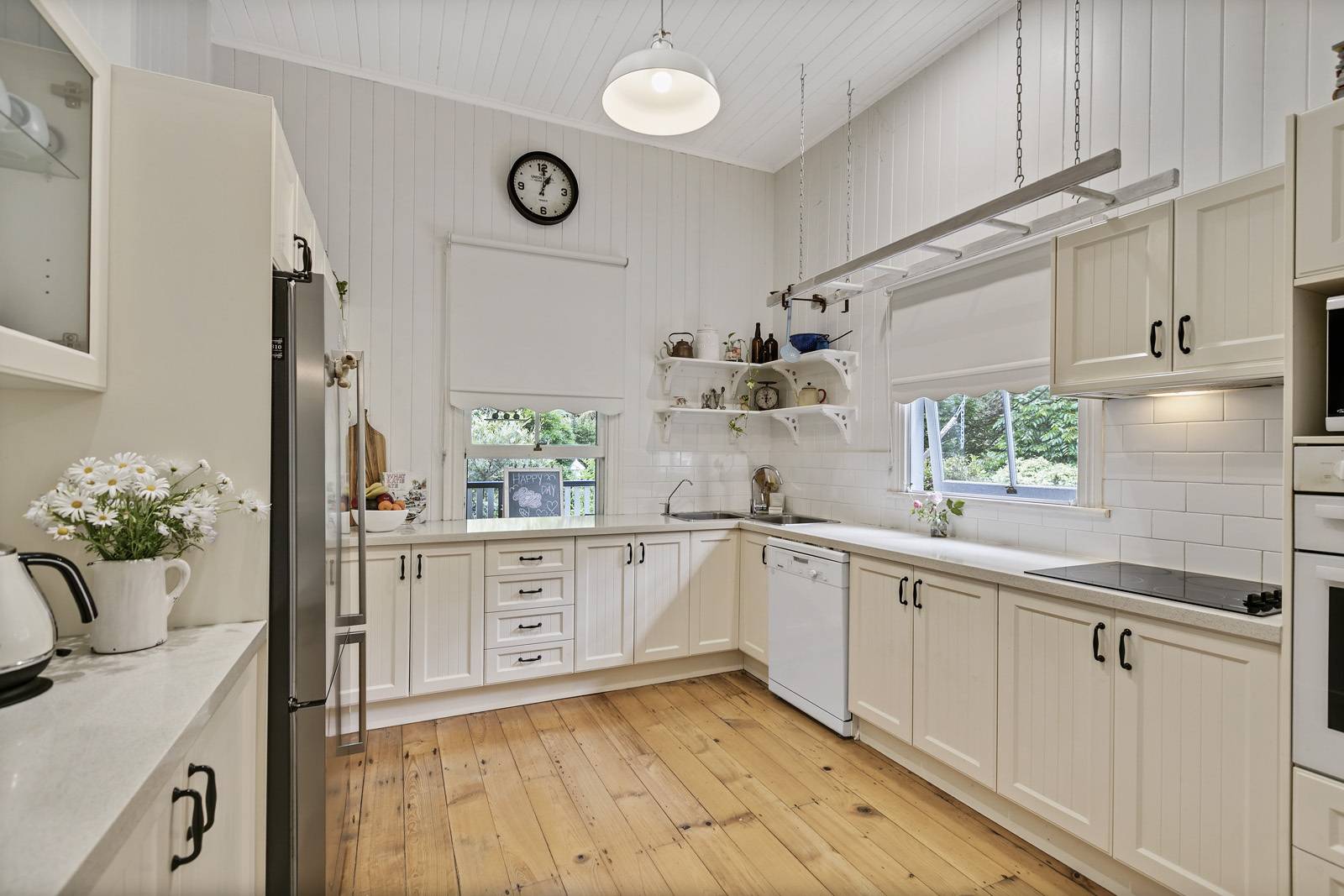Entering inside, the lounge dining and living areas reveal period VJ boards, high ceilings, ornate breezeways, fireplace and double hung windows flowing into a traditional - style kitchen, light and bright with a plethora of cupboards, stone benchtops and modern appliances. The kitchen overlooks majestic established gardens and trees, sprawling lawn for the children to play, vegetable beds and a large chook house.