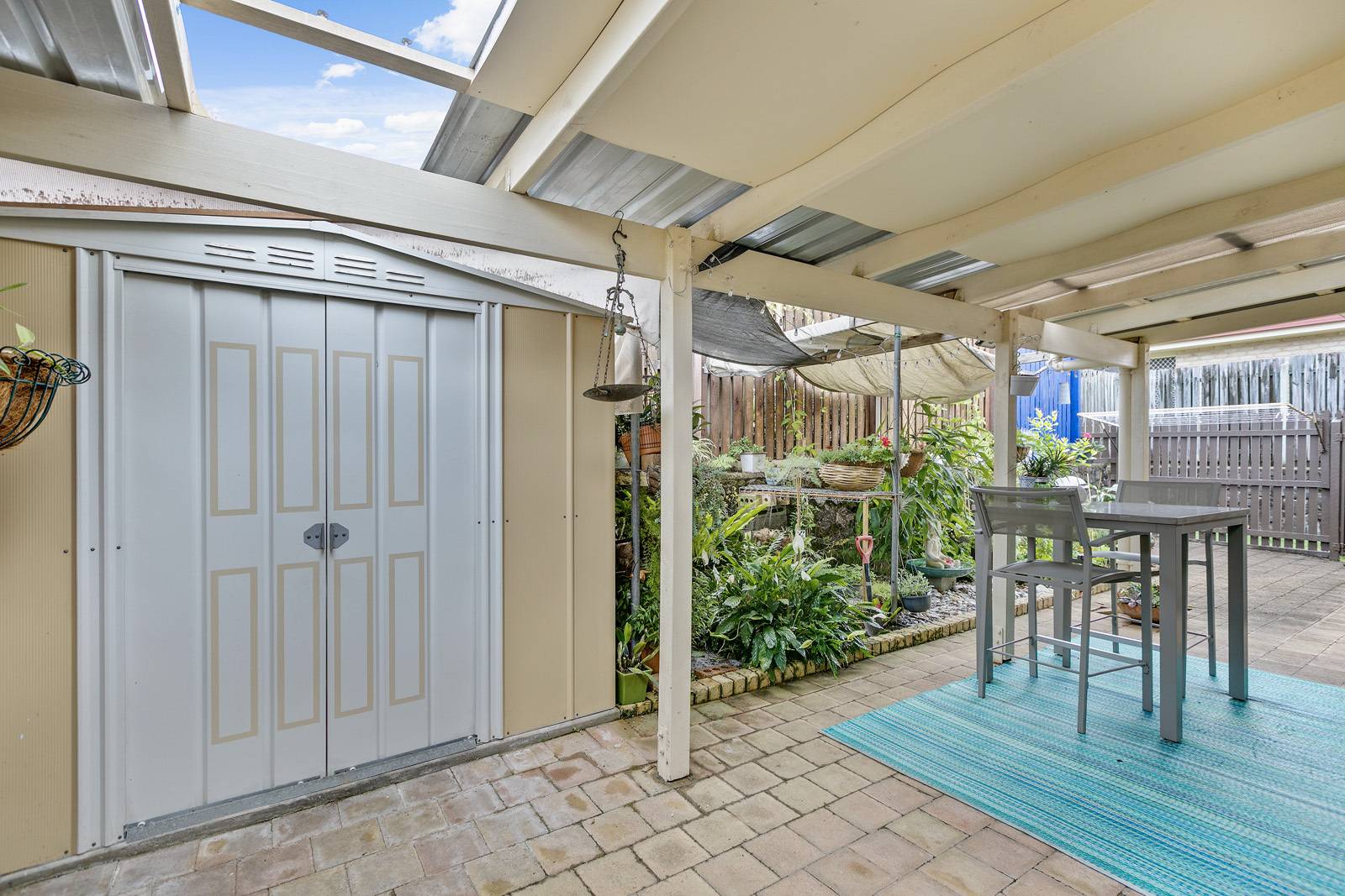 * Low maintenance tropical gardens and garden shed.