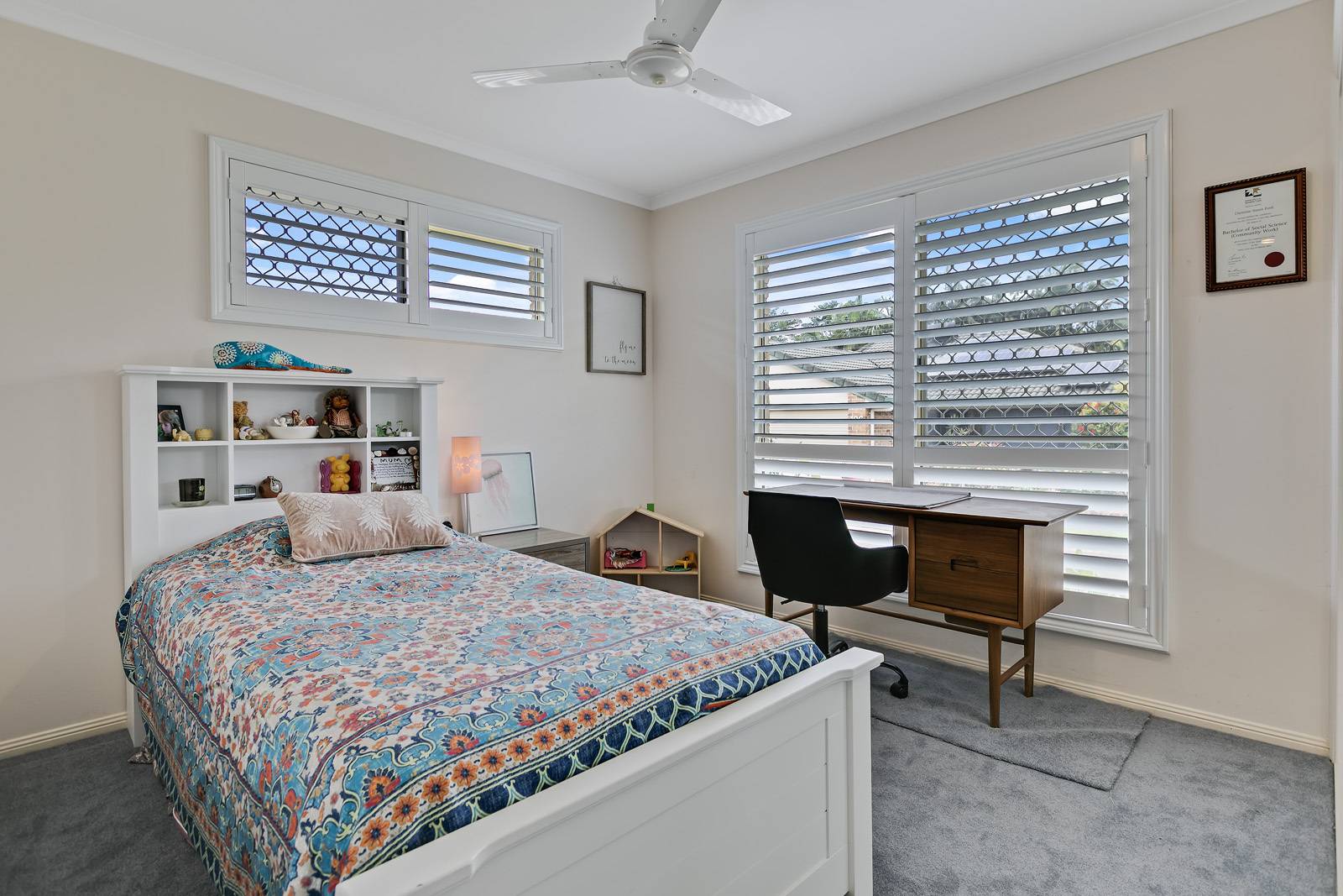 * Bedroom 2 and 3 is light and bright and has plantation shutters.