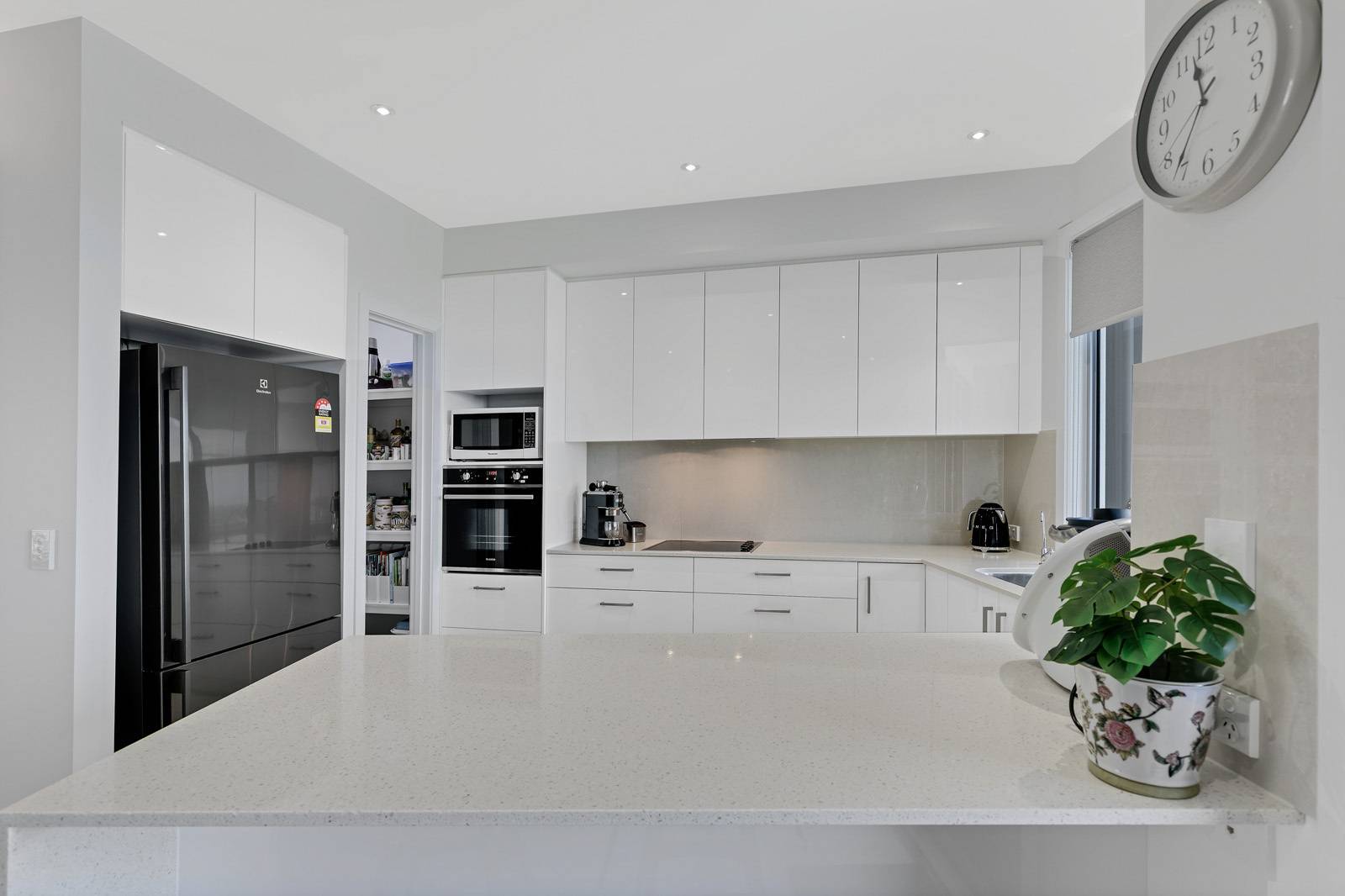 The impressive kitchen is centrally located with stone benchtops, stainless steel appliances, plethora of self-closing drawers, walkin pantry and a servery to the balcony.