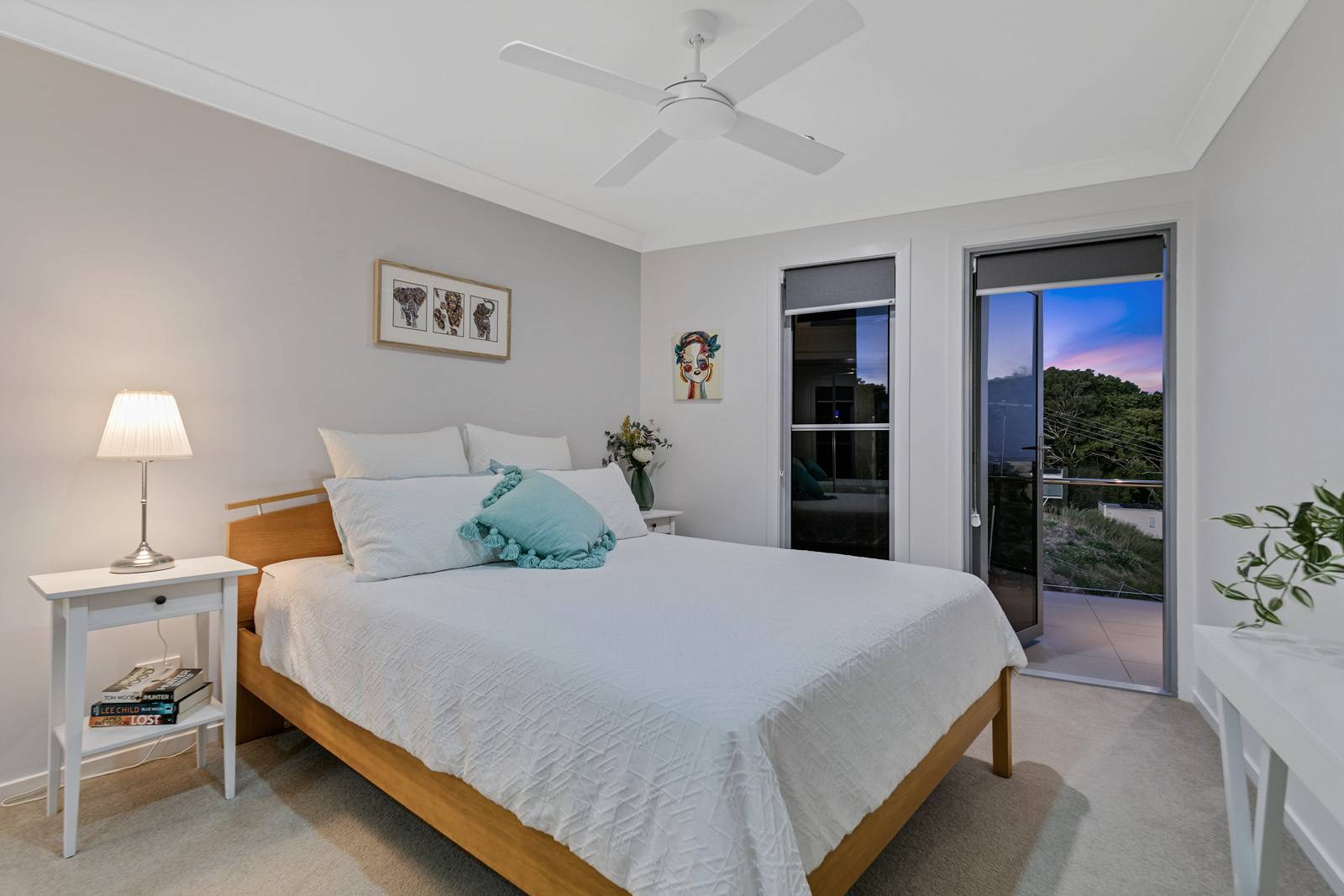 A generous size air-conditioned master bedroom with ensuite, separate shower, and walk- in robe, opens to a covered balcony to enjoy the views to the ocean. 2 remaining bedrooms, one air-conditioned have built-in cupboards, fans and access to the main bathroom.