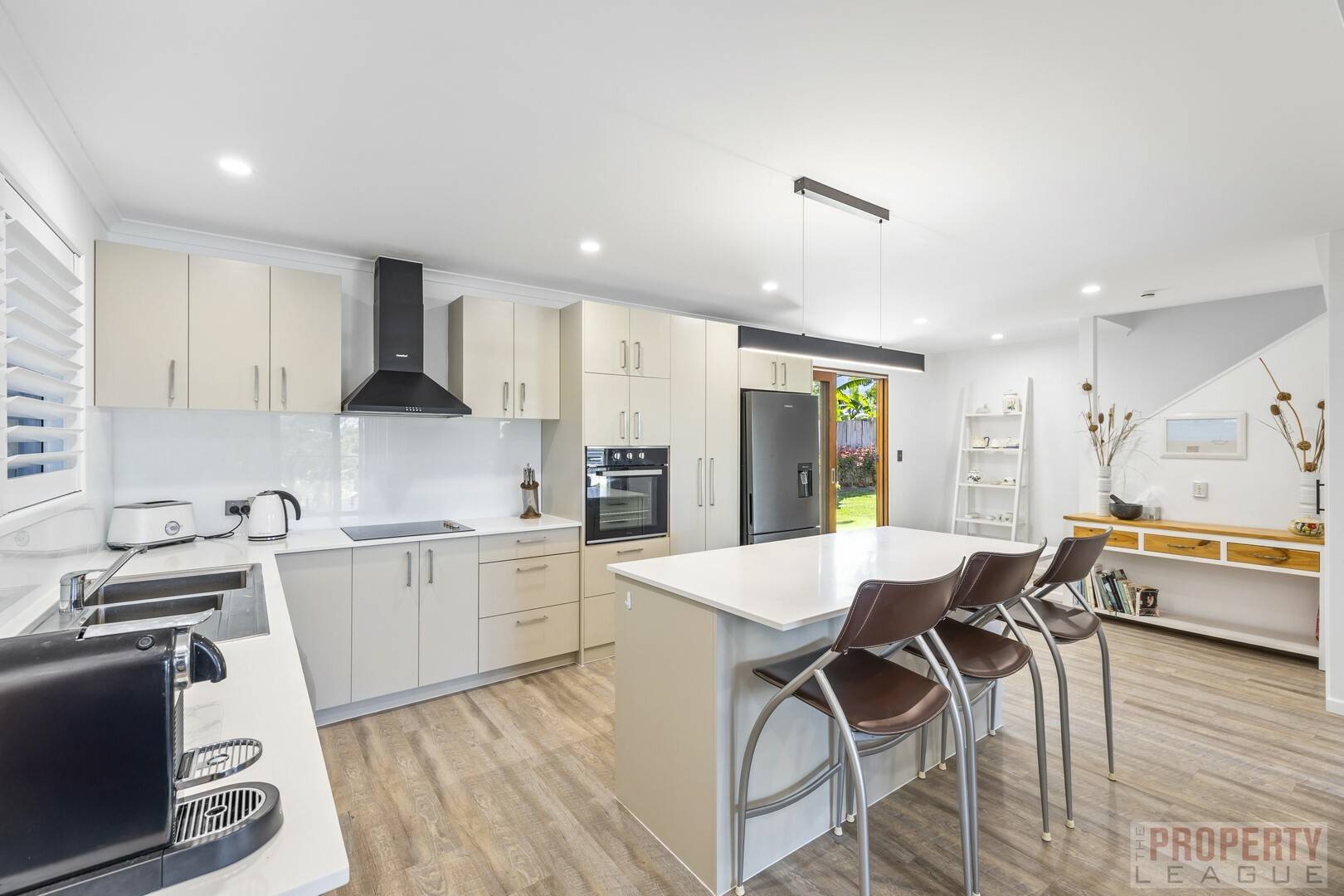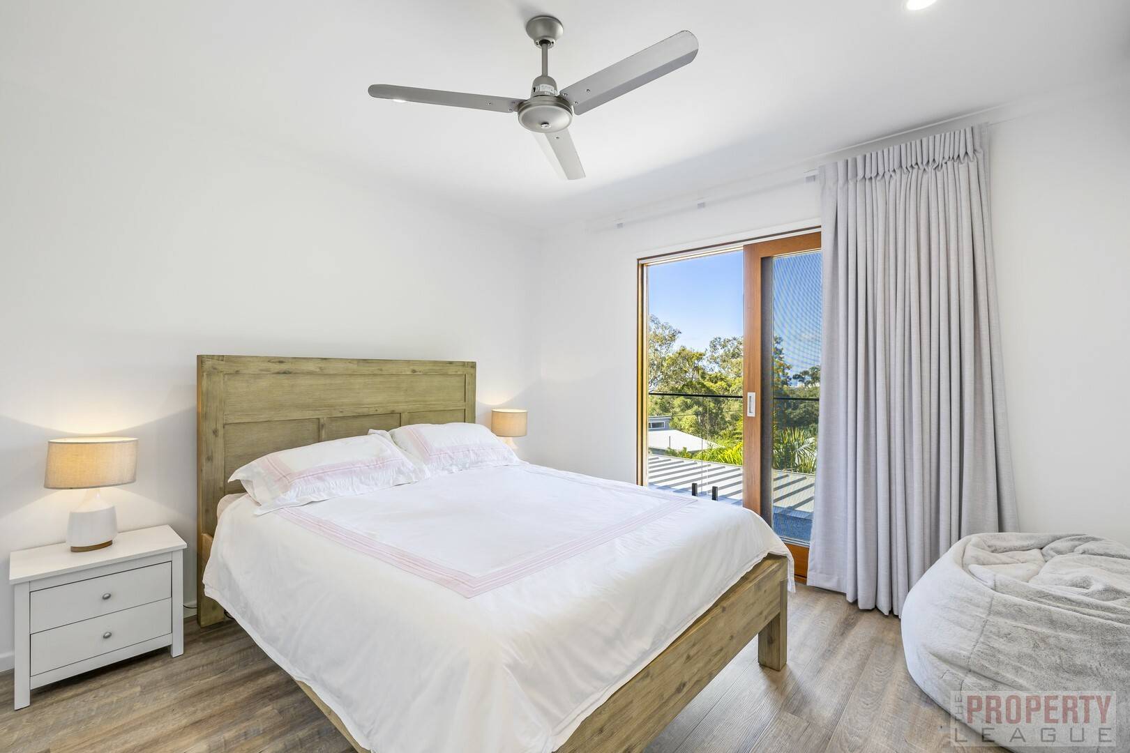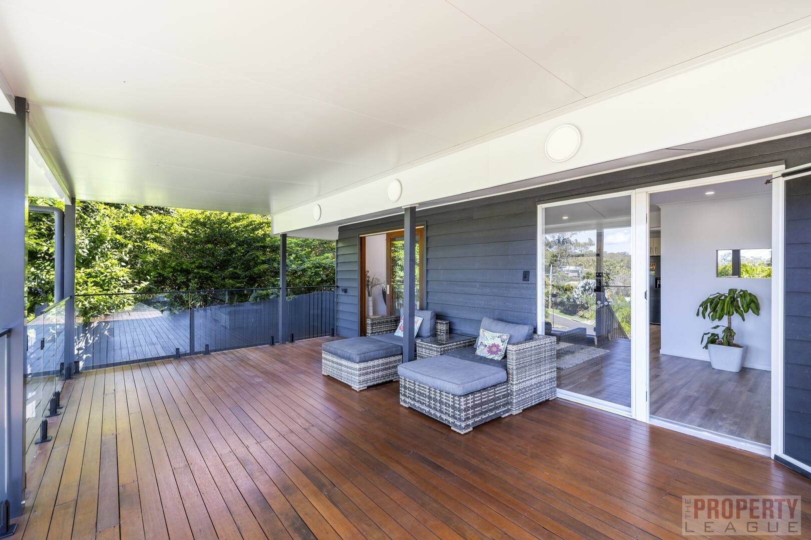 Upon walking through the expansive front lawn & gardens to your large entry stairs, you arrive at a tranquil timber entry deck area, fit for some balmy summer night entertaining even seeing some twinkles from the coastline through the trees.  Enter the thoughtfully renovated home through the feature timber entry door and you find a wonderful open plan split level living paradise.  An eye-catching kitchen with stone benchtops, induction cooktop, stainless steel appliances including dishwasher adjoin a large living area perfect for dining or a lounge area.  Up just a few steps is another 2 living spaces, perfect zones for reading, watching, dining and chilling.  Secreted off this area, with its own entrance, is a large 5th bedroom / home office with the laundry and separate toilet & powder room nearby.  This is so ideal for a home business / office, teenage retreat, guest area or media room.  Every living area and bedroom has its own air-con unit so if you live in one room mainly, or 2, or the whole house, you will never sweat or shiver again.  And don’t worry, the enormous 13.6kW solar system makes this comfortable and decadent climate control very affordable.
