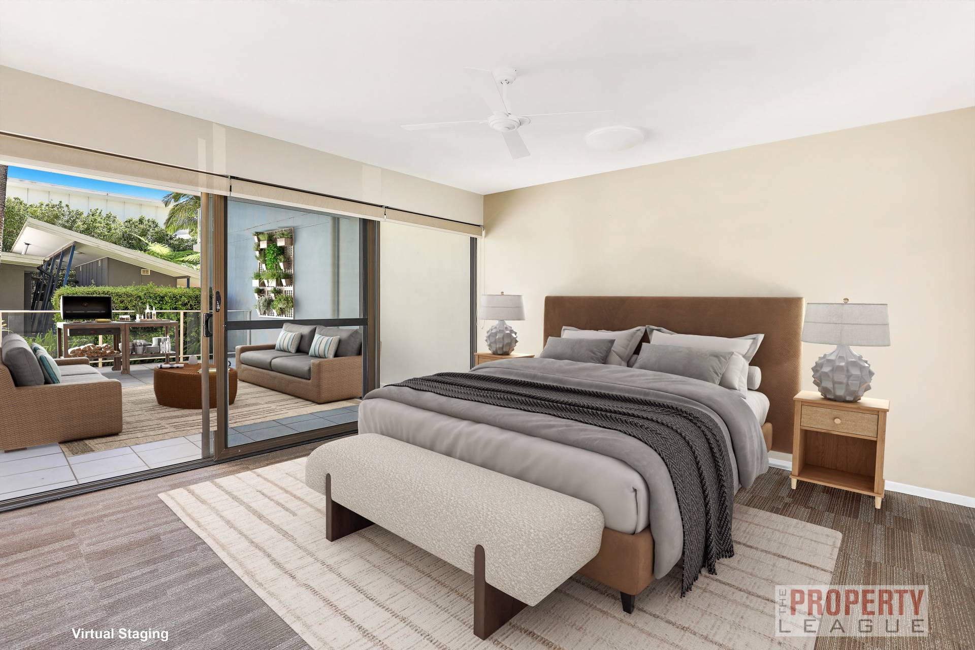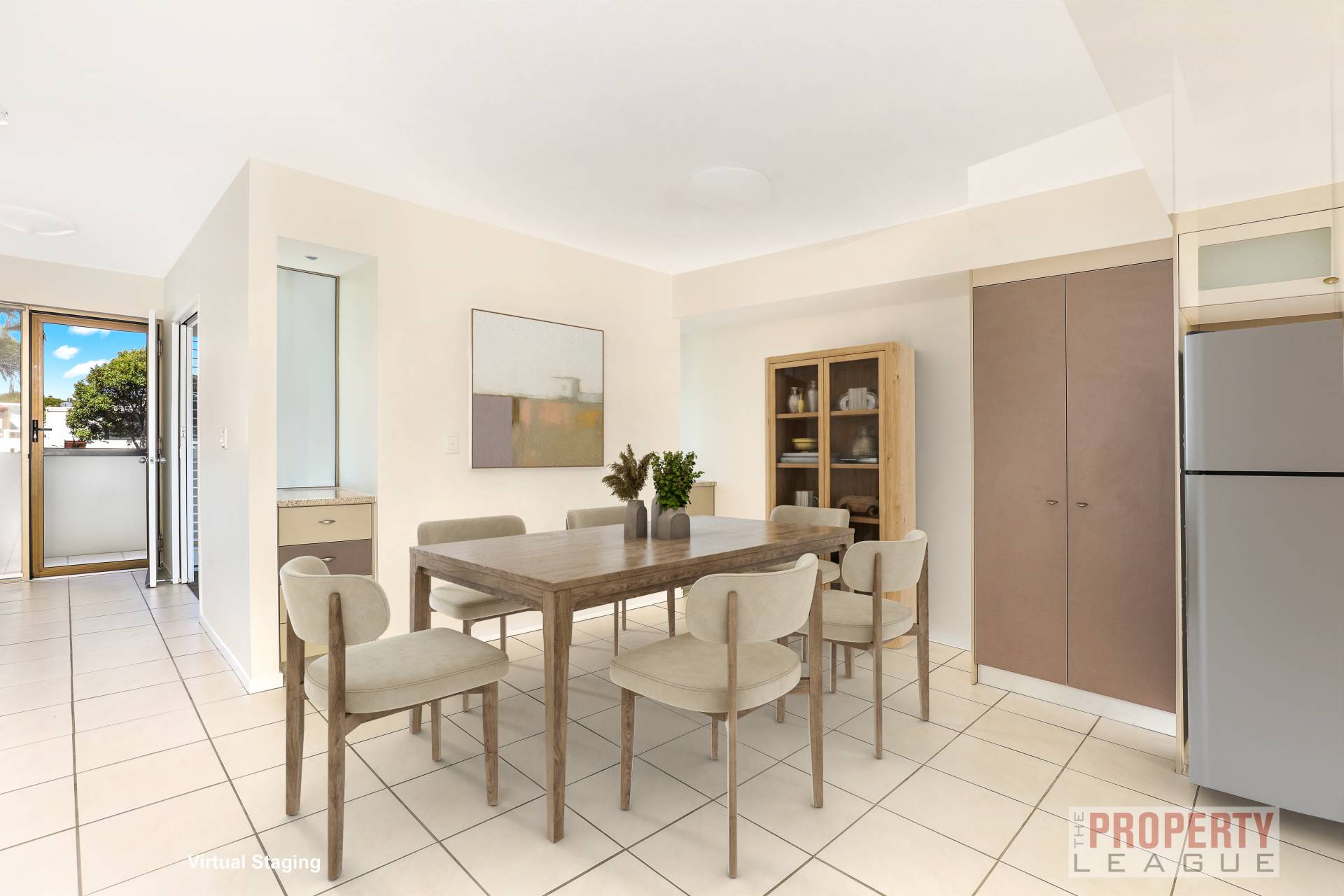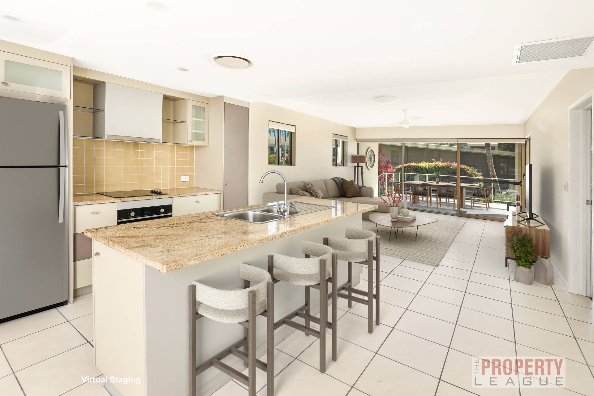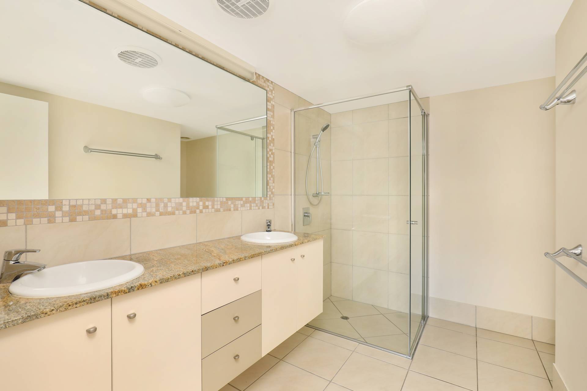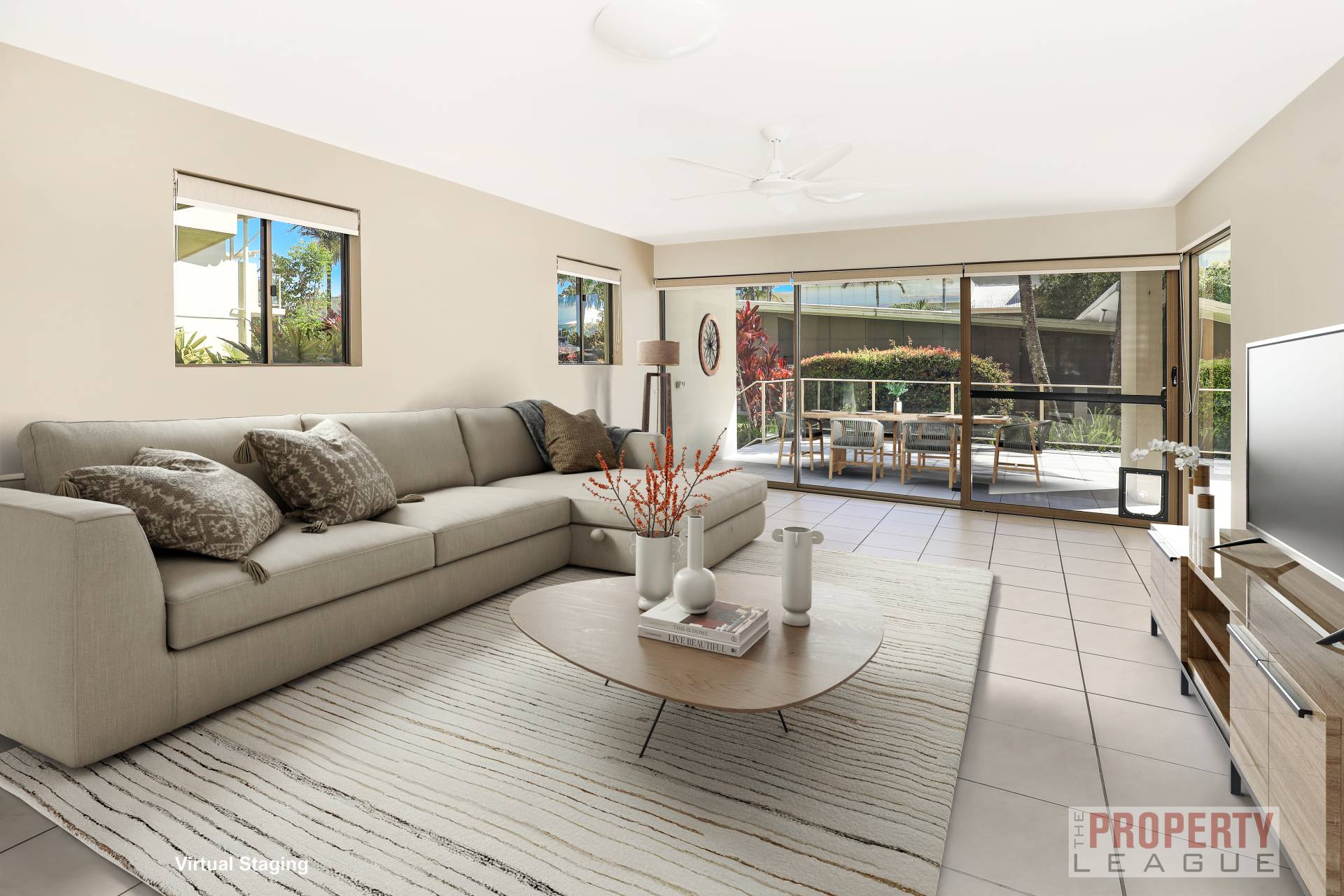 If you are looking for a very large spacious apartment with an extra large courtyard, offering easy access with 2 entrances north and south this is the perfect place for you!  Leeward Apartments Kawana Island offer large house sized apartments and this particular unit boasts a massive north facing terrace with only 4 steps down to the ground level.  From your terrace you can also enjoy amazing views across to the spa, lagoon and 2 lane lap pool all being framed with beautiful established palm trees in a tropical and resort style setting!