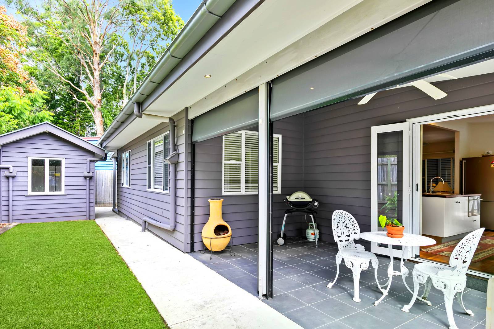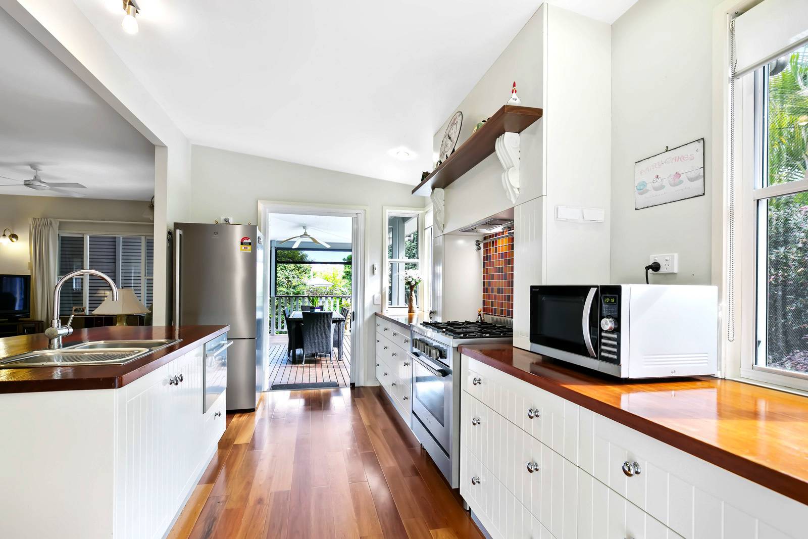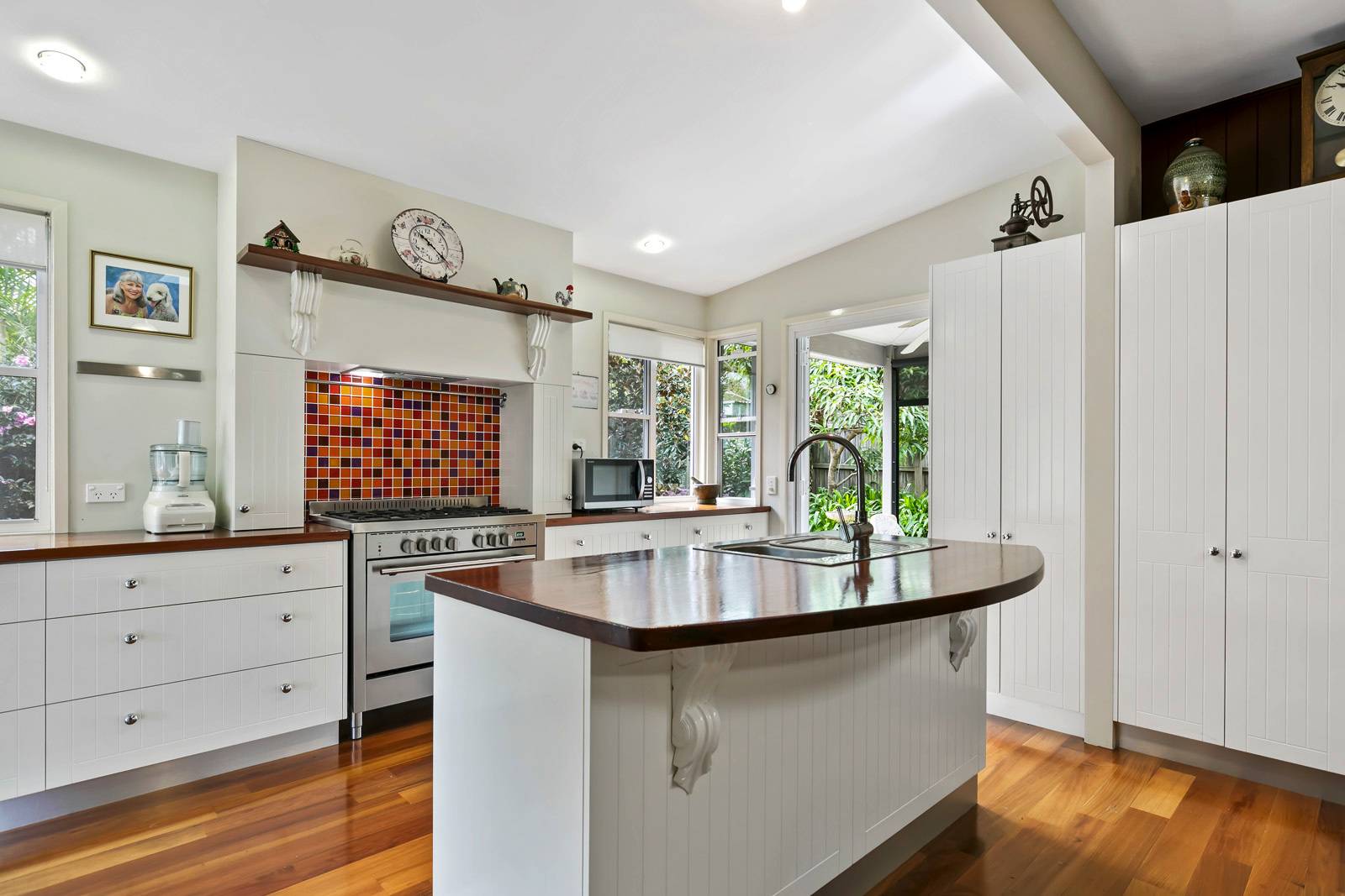 The living and dining area with timber floor, high ceilings and French doors is open plan and is adjacent to the kitchen with an island bench and excellent storage space.  The covered deck has room for alfresco dining.  A separate patio at the rear overlooks a private lawned garden.